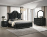 Indulge in timeless elegance and dramatic sophistication with this stunning bedroom collection, designed to make a bold statement. The centerpiece features an exquisitely tufted headboard with luxurious upholstery and intricate nailhead trim, exuding opulence and grandeur. Coordinating pieces showcase diamond-patterned tufted accents, mirrored details, and polished hardware, blending classic design with modern glamour. With ample storage and impeccable craftsmanship, this ensemble offers both style and practicality, creating a lavish retreat that embodies refined comfort and striking aesthetics. Perfect for those seeking a bedroom that radiates luxury and charm.