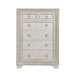 Bring elegance and functionality to your bedroom with our Camila 6-Drawer Chest. This piece displays a quiet, regal presence, featuring six drawers and silver-tipped intricate moldings for a shimmering, luxurious touch. A semi-transparent creamy white finish enhances the distinctive swirly ash veneer construction. Rosette-shaped silver drawer pulls and bracket feet complete the look, adding elegance to the overall aesthetic.