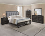 This bedroom set offers a sleek and stylish update to any space, featuring a rich finish that commands attention while maintaining a sense of warmth and coziness. The bed stands as the stunning centerpiece, with its high, padded headboard upholstered in a plush fabric that invites relaxation and comfort. Flanking the bed are matching nightstands, providing convenient access to storage and display space. The set is rounded out with a capacious dresser, accented with a broad mirror that adds depth and brightness to the room.