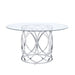 The Merlin Round Dining Table is what you have been shopping for! The ultracontemporary dining table is created with a tempered glass table top and a sleek, chrome table base. Circular designs accent the round drum table base. This table can accommodate up to four people comfortably, with standard dining height chairs. This dining table can be perfect for intimate family dinner or a cocktail party with friends. Pair this table with upholstered side chairs or arm chair set to complete the ultracontemporary setting.
