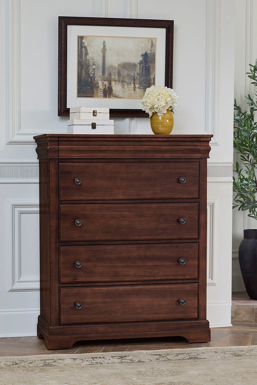 This four-drawer chest brings refined storage to traditional bedrooms with clean molding, antique nickel hardware, and a rich cherry finish. Felt-l...