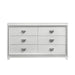 Moondance Dresser upgrades your room. This white finished double dresser features six spacious drawers. Showcases glimmering bling strip along the frame and unique black metal drawer pulls. Constructed of solid and manufactured woods for years of use. Includes ant-tipping hardware. Assembly is required.