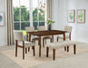 Transform your dining space with this elegantly designed dining set, where timeless craftsmanship meets modern comfort. Featuring a beautifully finished wooden table with rounded edges, this ensemble creates a warm and inviting atmosphere for family meals and gatherings. The sleek, upholstered chairs and bench offer a touch of sophistication, with plush, tufted fabric providing both style and superior comfort. The sturdy wooden legs enhance durability while maintaining a refined aesthetic. Perfect for contemporary and transitional interiors, this dining collection combines function and charm, making every meal an experience in effortless elegance.