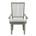 A great dining experience requires a great chair. This one borrows from traditional designs and updates them with a buff gray finish that lets the wood grain show through. Turned front legs and the slat back hark back to gathering around a great farm table and padded upholstered seats provide comfort and support. Arms are beautifully shaped with a knuckle detail.
