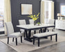 A fresh take on a traditional silhouette makes this group a great addition to your dining space. A faux marble top provides an elegant look while being easy to care for. The trestle base is updated in a contemporary finish. The upholstered dining chairs feature gently sloped wings and a nail head trim on the back. Button tufting accents the dining bench.