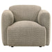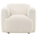 This modern accent chair brings sculptural softness and deep comfort to any living space. Wrapped in a richly textured fabric, its rounded frame flows from low-profile back to wide track arms with effortless ease. Plush foam cushioning and pocket coil seating deliver the ideal blend of sink-in softness and lasting support. With its minimal silhouette and gentle curves, this chair adds a cozy yet elevated presence to any room.