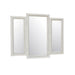The grand trifold Camila vanity mirror has romantic silver-tipped moldings seen throughout the bedroom collection. The trifold design is ideal for multi-angle viewing, and each mirror is beveled. The semi-transparent creamy white finish enhances the distinctive swirly ash veneer construction. Substantial wooden supports ensure that the mirror mounts securely to the vanity.