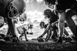 Capture the raw energy and anticipation of a football game with this striking photograph. Featuring players poised for action under a dramatic sky, this piece brings the excitement of the gridiron to your space. Perfect for sports enthusiasts, it adds a dynamic touch to any room.