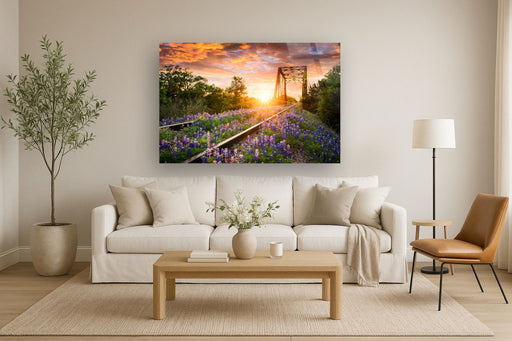 Classy LivingBluebonnet Rails captures a breathtaking scene where vibrant bluebonnet flowers bloom abundantly along rustic railroad tracks, leading toward a glo...
