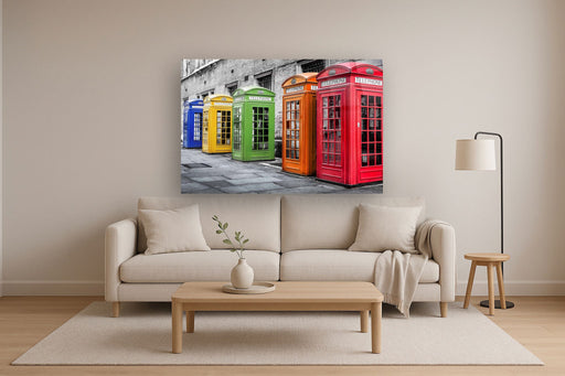 Classy LivingBrighten your space with "Phone Booths in Color," a striking photographic wall art piece printed on durable tempered glass. Featuring a vibrant lin...