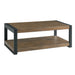 Add touch of industrial style to your living space with the Caesar occasional collection. This set includes one coffee table and two end tables dressed in an earthy finish. Distress makings give this set an inviting, lived-in feel while charcoal finished metal legs provide an urban flare