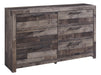 Modern yet hefty. This dresser makes an urban eclectic statement. Seasoned raw wood look merges with the clean lined design we love today. Muted rustic finish over replicated pine grain maintains its authenticity. Roomy drawers are flanked with attractive framed front and pilasters. Handles with antiqued gunmetal finish complete this beauteous look with easy to pull function.