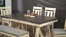 Form and function work beautifully together in the Maribelle dining group. The trestle base table features dual draw leaves that tuck away neatly and provide extra space when needed. The sturdy bench and chairs feature cushioned seats with gray linen weave upholstery. The two tone finish is on trend and fits into a variety of decor styles.