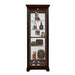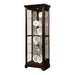 This display curio offers both high-end style and a roomy interior for your treasured collections. The dark cherry brown finish uses wood rub-through and simple design elements to reflect a transitional style that works well with any decor. The front of the case is constructed with a two-way sliding door with a lock for security, while a mirrored interior back allows you to view contents from any angle Five adjustable glass shelves offer customized storage and display, and a single halogen can-style light clicks on with a roll-switch for nighttime viewing. The case is decorated with reeded pilasters and diamond-shaped carvings at the top for added elegance.