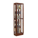 Classic meets contemporary in this slim modern curio. You can place it almost anywhere. You could even use a pair as columns in a dining or living room for architectural interest and flair. Our curio is solidly built in select hardwood solids and veneers with a Cherry wood finish. It features a mirrored back, halogen lighting, adjustable glass shelves, adjustable glides for leveling, and right-side entry.