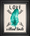 This striking framed wall art features a vibrant teal feather set against a soft neutral background, accented by the inspiring phrase "Love without limits." The bold graphic design blends botanical elements with motivational typography, making it a powerful statement piece for any living room, bedroom, or office. Encased in a sophisticated midnight aura frame with real glass, this artwork enhances color vibrancy while offering protection. Crafted with expert care, it embodies a transitional style that invites limitless love and courage into your space, ready to hang and inspire every day.