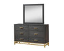 Step into a realm of contemporary sophistication with this bedroom collection. Flaunting a harmonious blend of rich, warm wood tones and bold, metallic accents, each piece exudes a luxe yet inviting appeal. The bed, with its sleek, linear design and striking headboard, becomes the centerpiece, complemented by storage options that blend functionality with chic, clean lines.