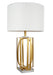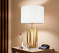 This lamp is a striking fusion of modern design and minimalist elegance. The base features a golden cage-like structure that exudes contemporary sophistication, supported by a sleek, polished chrome square that adds a touch of reflective brilliance. The lamp's slender profile is crowned with a classic, off-white drum shade that diffuses light warmly, creating an inviting ambiance in any room.