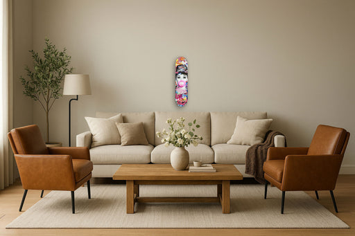 Classy LivingThis striking wall art piece combines bold street art aesthetics with modern neon flair, capturing a captivating portrait on a hand-painted skatebo...