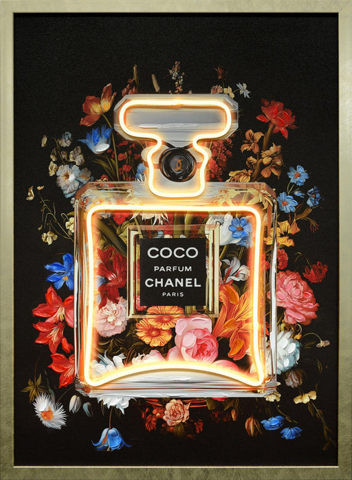 Classy LivingIlluminate your space with the "Elegant Neon Perfume Bottle," a captivating hand-painted mixed media wall art piece that combines classic floral ar...