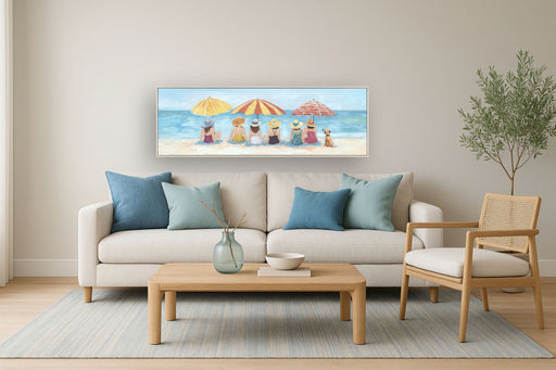 Classy Living“Gather in the Shade” captures a serene coastal scene where six figures and a dog relax under colorful beach umbrellas by the ocean. This hand-pain...