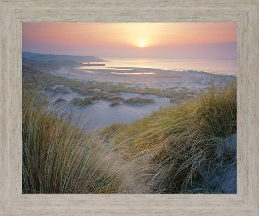 Classy LivingStep into a tranquil morning with this captivating framed photographic print that showcases the soft glow of sunrise over sandy dunes and coastal g...