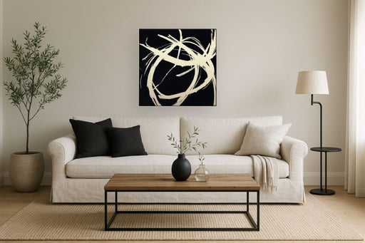 Classy Living“Midnight Motion Bold Abstract” is a striking contemporary piece that commands attention with its dynamic swirls of metallic champagne gold against...