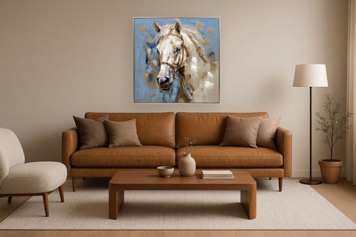 Classy Living“White Horse on Blue” is a captivating hand-painted oil canvas that brings the serene beauty of a noble white horse to your living space. The conte...