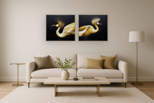 Classy LivingThe "Golden Majesty Crane Pair" is a stunning hand-painted canvas set that captures the elegant beauty of two majestic cranes against a deep black ...