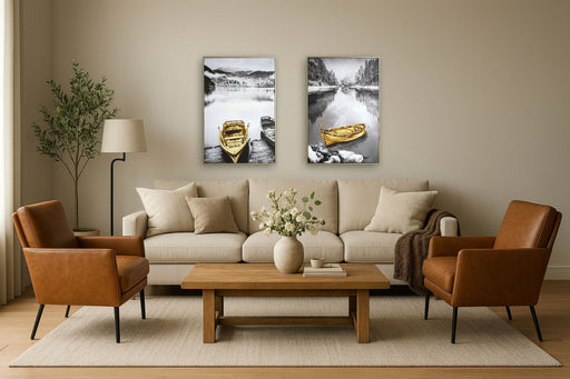 Classy LivingExperience the tranquil beauty of nature with "Golden Serenity Reflections - Set of Two," a captivating hand-painted mixed media canvas set. Each p...