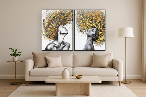 Classy LivingThe "Gilded Muse Diptych" is a captivating two-panel mixed media wall art piece that masterfully blends textured canvas with hand-applied gold and ...