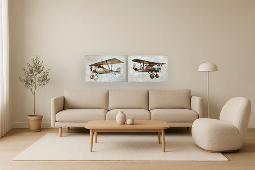 Classy LivingThe "Rustic Aviator Duo" is a captivating hand-painted wrapped canvas set that brings vintage aviation charm to your space. Featuring two detailed ...