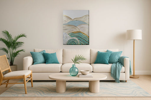 Classy LivingImmerse yourself in the tranquil beauty of this contemporary abstract piece, where soothing layers of teal, gold, cinnamon, and mocha blend seamles...
