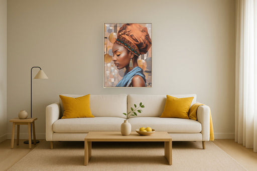 Classy LivingGolden Dusk: Regal Profile Portrait captures the serene beauty and strength of a woman adorned in vibrant traditional attire. This hand-painted can...