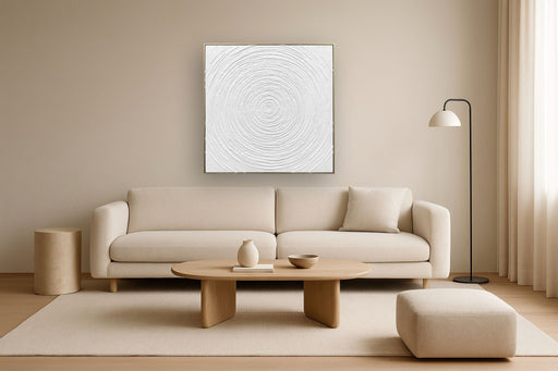 Classy Living“White Radiance: Textured Concentric Circles” is a stunning hand-painted mixed media canvas that captures the essence of contemporary abstract art....