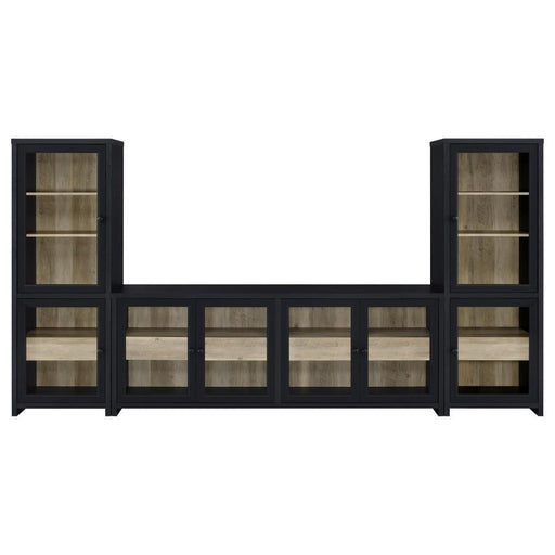 Coaster Fine FurnitureThis expansive media console merges bold presence with discreet practicality. Framed in a striking black finish, four glass doors reveal warm wood-...