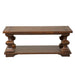 Elevate your space with the Spanish style Sedona cocktail table. Crafted of rubberwood solids, this piece features a Kona brown finish, appealing planked top with square peg accents, bottom shelf for additional storage, anchored by large Spanish style square turned legs. This gorgeous cocktail table will be a great addition to any traditional style space.