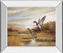 Experience the tranquil beauty of nature with this captivating depiction of mallards in flight. Set against a misty, golden-hued landscape, the artwork captures the delicate grace and vibrant colors of the ducks as they glide over a serene marsh. The mirrored frame adds a modern touch, enhancing the depth and reflective quality of the scene, making it a perfect centerpiece for any living room or office. Crafted with meticulous detail and protected by crystal-clear glass, this piece invites you to pause and appreciate the peaceful moments found in the natural world.
