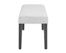 This sleek and modern dining group bridges form and function. The sculptural dining table has a sturdy base and the glass top allows views of the upholstered open shelf. Streamlined chairs and bench feature pewter finished wood and upholstery with a subtle glitter sheen.
