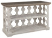With its richly rustic finish and textural mix, this sofa table goes to town on bygone beauty. Its distressed two-tone treatment blends a weathered gray with vintage white for an utterly charming effect. Balustrade-style planks supporting the top create an eye-catching look that’s anything but ordinary.