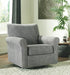 Sporting a tantalizing tweed weave fabric in such a soothing blue hue, this swivel glider accent chair gives the classic roll arm chair a modern twist. Smooth, 360-degree swivel caters to your comfort—and your viewing pleasure. Gentle glider feature is designed to rock your cares away.