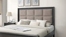 This contemporary bedroom set boasts a sophisticated aesthetic, characterized by its deep espresso finish that speaks to modern tastes. The clean-lined bed features an elegantly tufted headboard, offering both comfort and style, and is complemented by streamlined nightstands and a dresser with a sleek, matching mirror. The brushed metal hardware provides a subtle contrast, highlighting the set’s chic and urbane design.